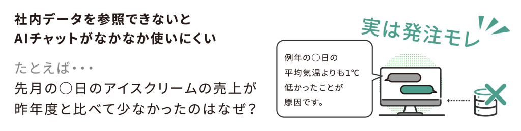 たとえば、上のイラストに示した「先月の○日のアイスクリームの売上が昨年度と比べて少なかったのはなぜ?」とユーザーが尋ねた場合を例にします。本当の原因は「発注漏れによる欠品」なのに「例年の○日の平均気温よりも1度低かったことが原因です。」という一見正しそうな回答を得ることで、本当の原因を見逃すということが起き得ます。もちろんLLMは「欠品」も「発注ミス」も知識として知っていますが、小売企業にとっては大問題な欠品がLLMにとっては優先度が低いこととして認識されかねません。
